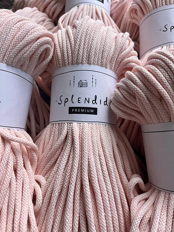 Az 5 mm-es prémium Splendid zsinórfonal  újrahasznosított pamutból készül, a közepén a színével azonos pamut “maggal”. A minőségi textúra, kiválóan alkalmassá teszi az egyedi technikák alkalmazásával készített horgolt, kötött, vagy makramézott alkotásokhoz.